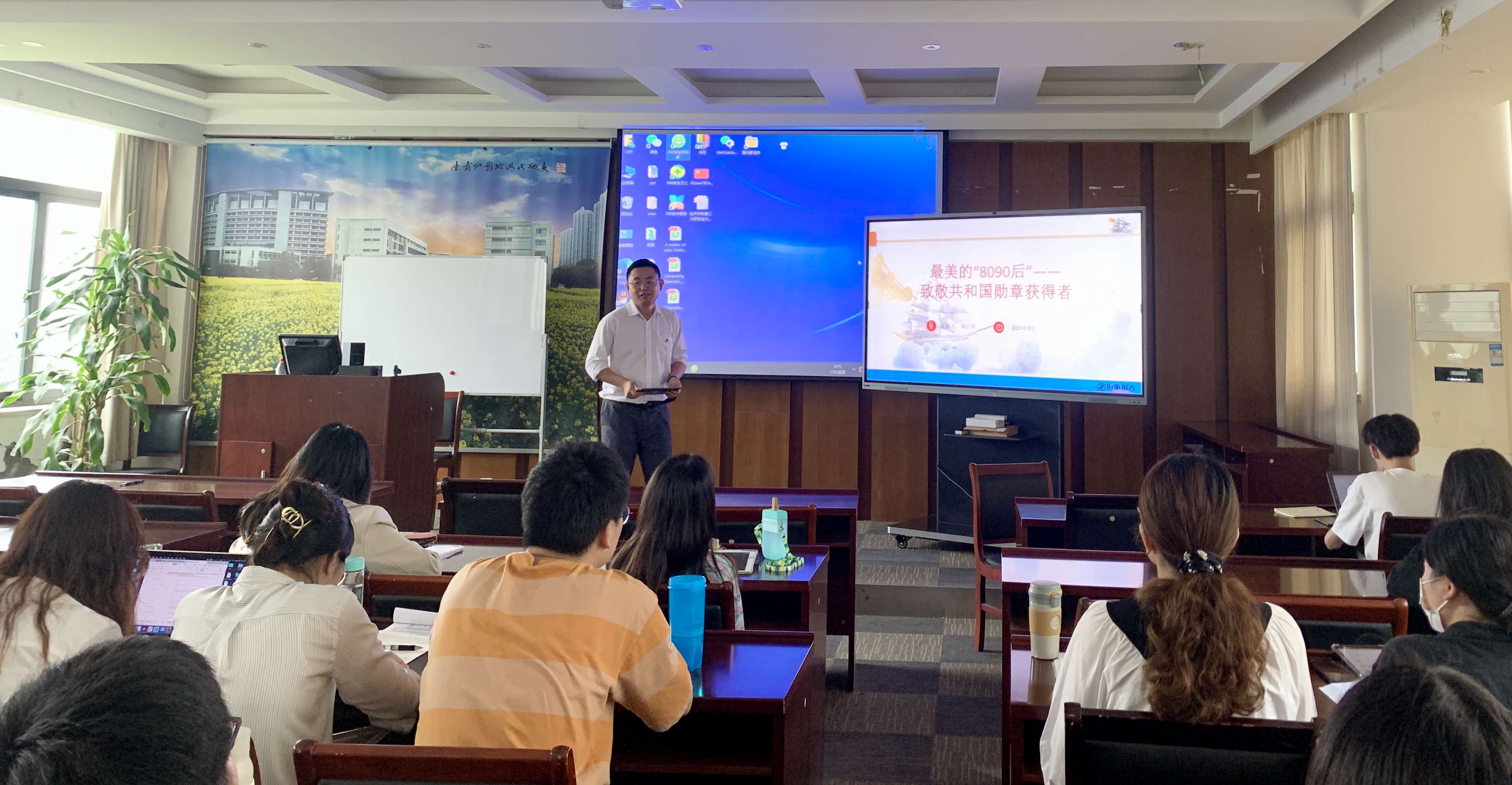 接着,郑云华老师生动讲述了共和国勋章获得者的主要事迹,将一个个熠熠生辉的名字,一段段感人至深的故事,深深烙印在学生党员的心中。行程万里,初心依旧,追梦远方,使命不改。他鼓励学生党员以英雄模范为榜样,坚守报国初心,用信仰的青春向祖国告白;勇担时代使命,用奋斗的青春向祖国告白;厚植为民情怀,用奉献的青春向祖国告白;锤炼品德修为,以真才实学服务人民,以创新创造贡献祖国,书写出无愧时代、不负人民的青春答卷。