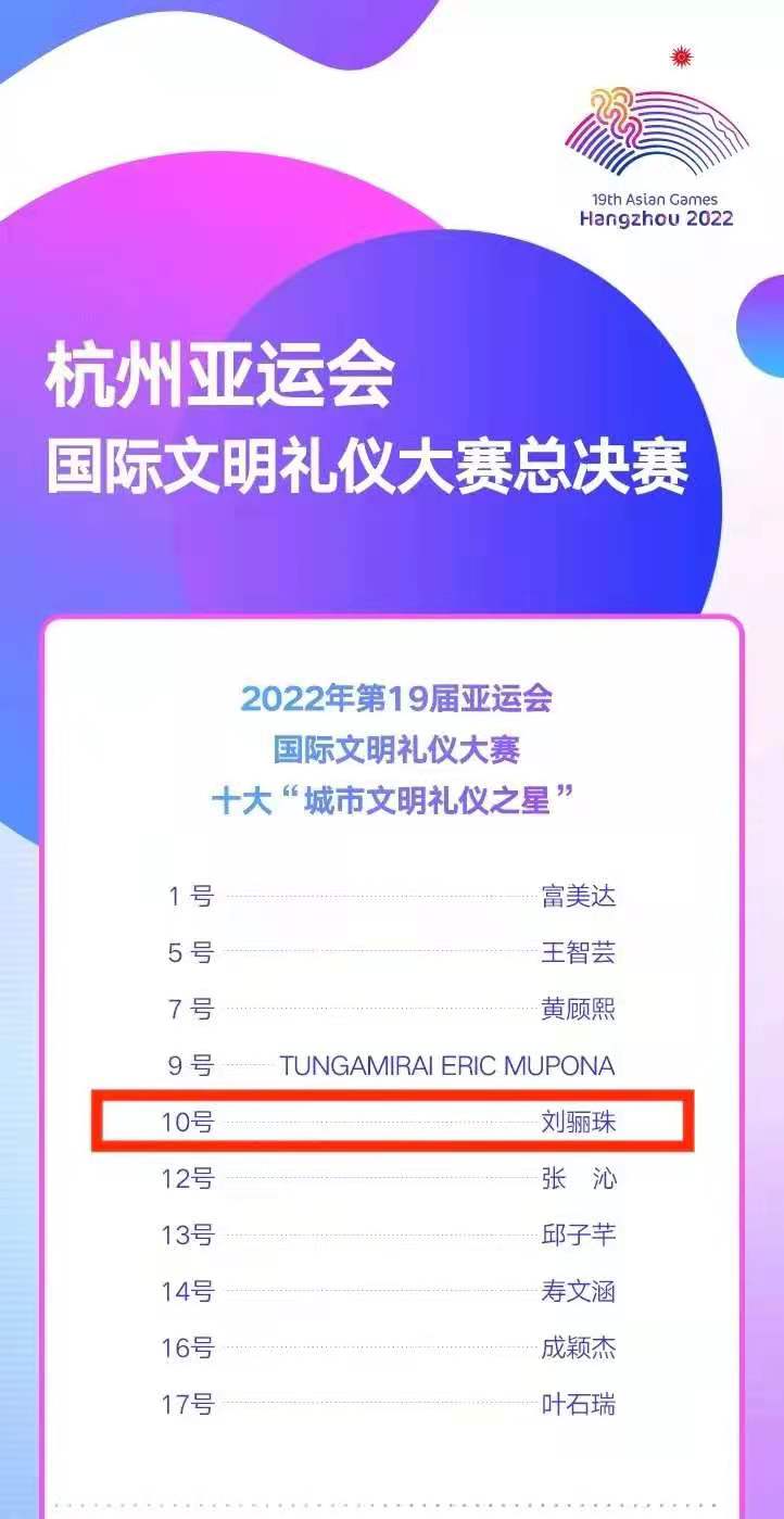 近日,杭州2022年第19届亚运会国际文明礼仪大赛总决赛在杭州电视台举行。我院辅导员刘骊珠,在2万余名参赛选手中脱颖而出,当选十大“城市文明礼仪之星”。