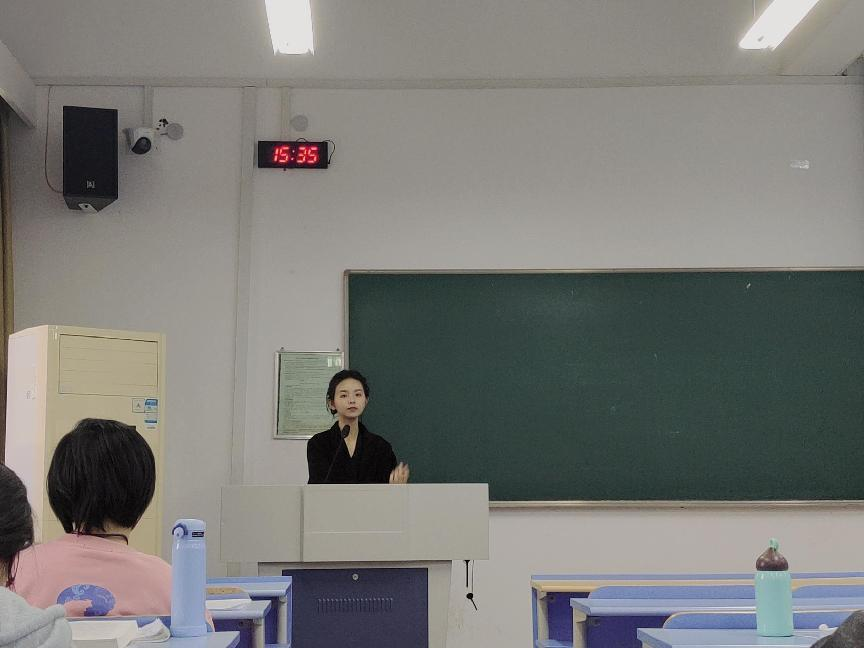 在同学们写完感想后,刘骊珠老师开始为大家线下授课。刘骊珠老师以“共同富裕”为主题,以“作为青年的我们在共同富裕事业中可以做什么”为引,讲述了浙江力量、青年力量与共同富裕之间的紧密关系。通过列举武汉、四川理塘等地的例子展现全国视域下共同富裕的实践进程,随后回到浙江境内,展现“浙”里蓝图与杭州在共同富裕方面做出的实际贡献。最后,刘老师告诫同学们共同富裕追求的不仅仅是物质富裕,更是精神富裕,并鼓励学生们立志立决心,将个人价值融入社会价值之中。
