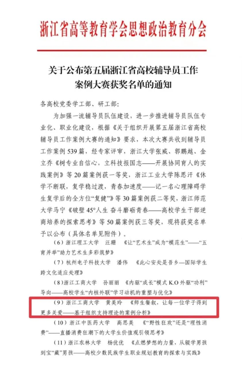 近日,浙江省高等教育学会思想政治教育分会公布了第五届浙江省高校辅导员工作案例大赛的获奖名单,我院辅导员黄美玲撰写的工作案例《师生餐叙,让每一位学子得到更多关爱——基于组织支持理论的案例分析》荣获第五届浙江省高校辅导员工作案例大赛三等奖。
