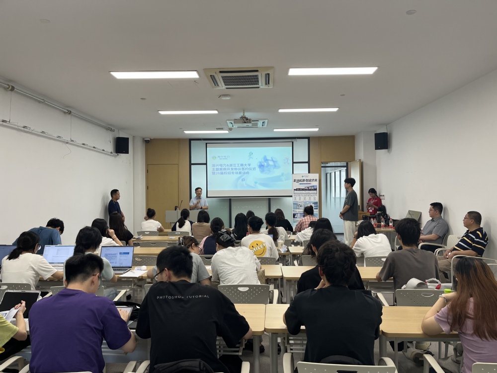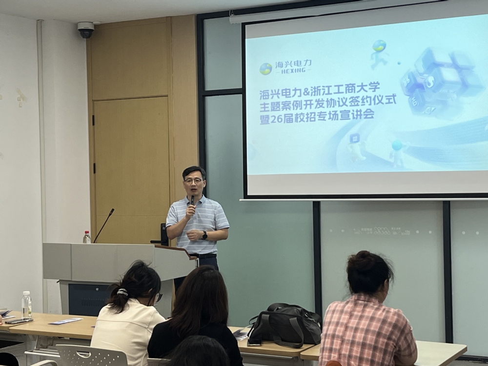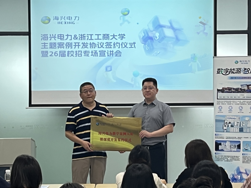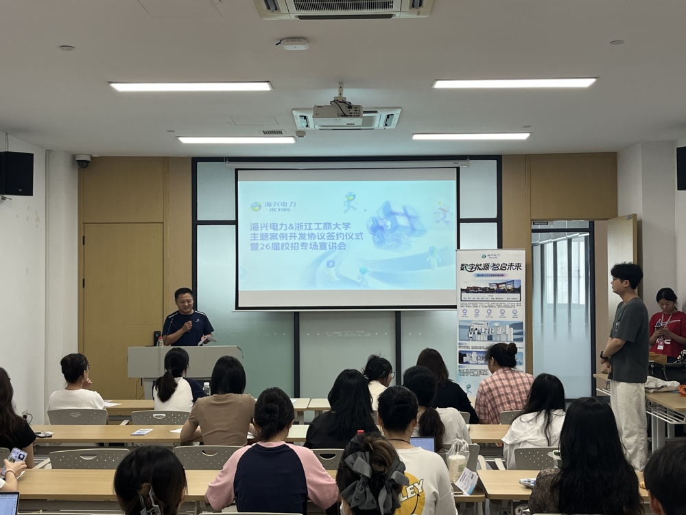 9月23日下午,杭州海兴电力科技股份有限公司2026届校园招聘会暨主题案例入库仪式在师生之家就业宣讲厅举行,海兴电力总裁办秘书,人力资源部,经济学院党委书记虞晓东,经济学院俞毅教授,校就业工作主管常建军,经济学院学办主管薛陈炎参加招聘会,近30余名学生参加宣讲会。